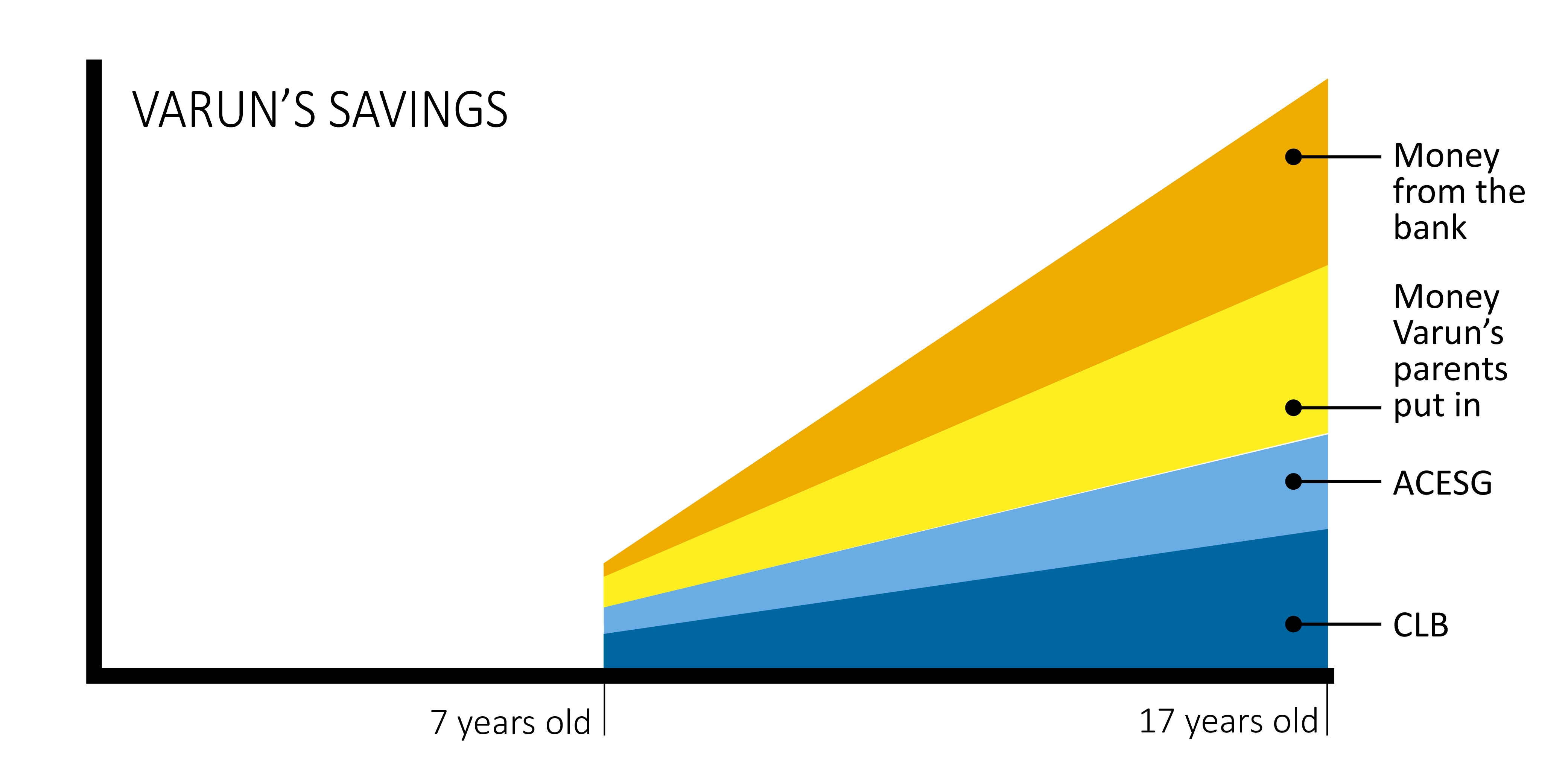 Varun’s parents have around 10 years to save up. They open an RESP savings account to receive the free Government grant money. They also invest some money every month in a GIC, which grows a little faster.